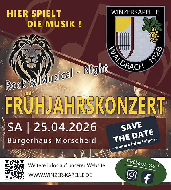 Am 12. April 2014 gibt die Winzerkapelle Waldrach ihr traditionelles Frühjahrskonzert in der Aula der Ruwertalschule. Konzertbeginn ist 20.00 Uhr. An diesem Abend wird die Winzerkapelle ihr neu einstudiertes Konzertprogramm vorstellen. Es erwartet die Besucher ein bunter Strauß abwechslungsreicher Blasmusik vom Musical über Filmmusik bis zum traditionellen Marsch. Außerdem wird das Jugendorchester das Programm mit eigenen Musikvorträgen bereichern. Der Eintritt von 6 Euro ist für die Jugendförderung und Ausbildung in der Winzerkapelle bestimmt. |